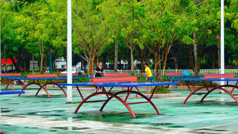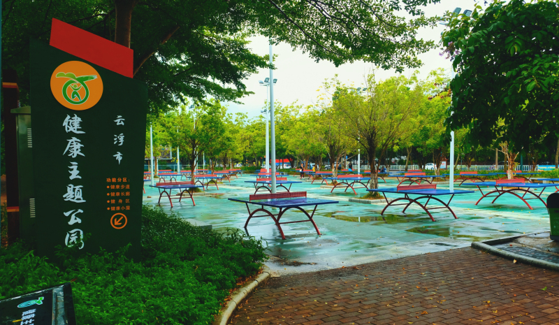 过了桥,有个小小的健康主题公园,健身区摆放了一排一排的几十张乒乓球桌。