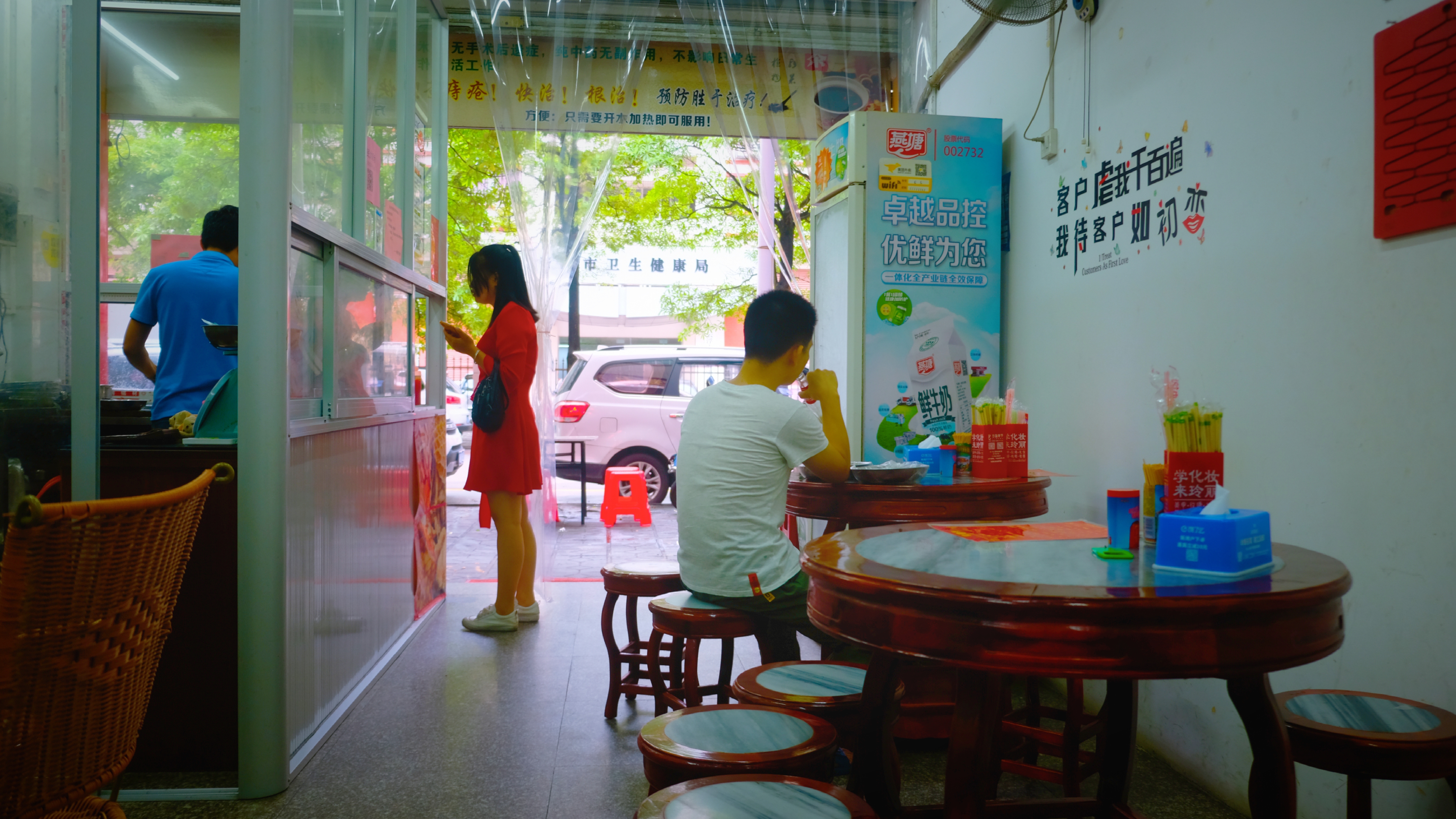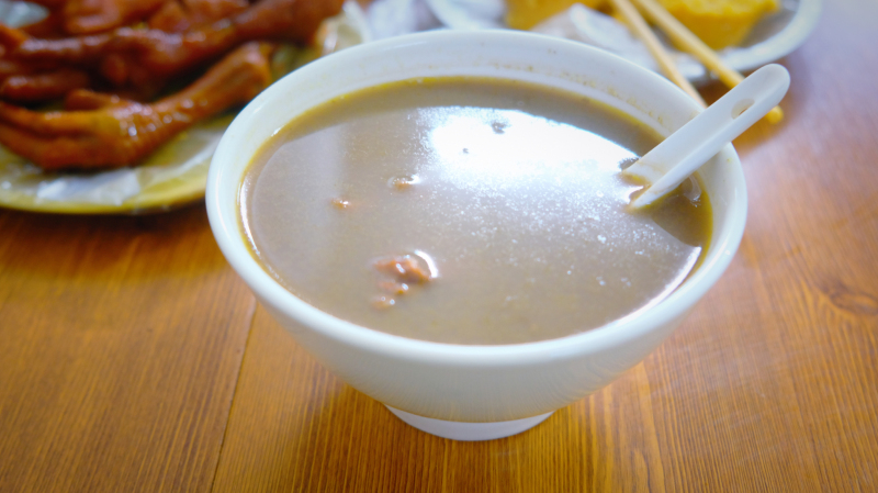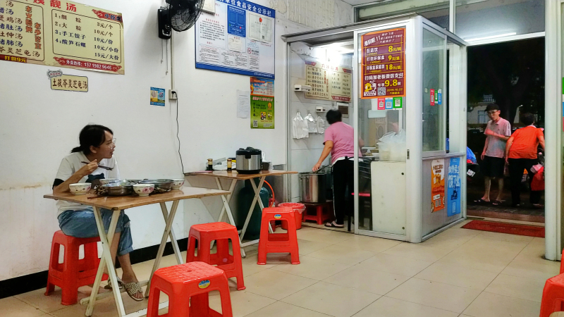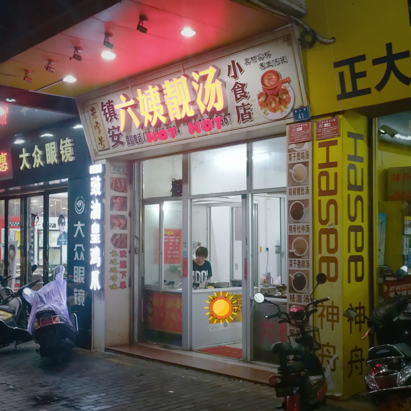 店铺面积不大,只有几张桌子,两个售卖食物的小窗口,左边卖鸡爪,右边是我要找的六姨靓汤。