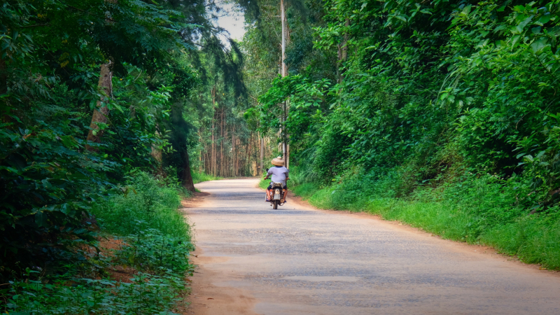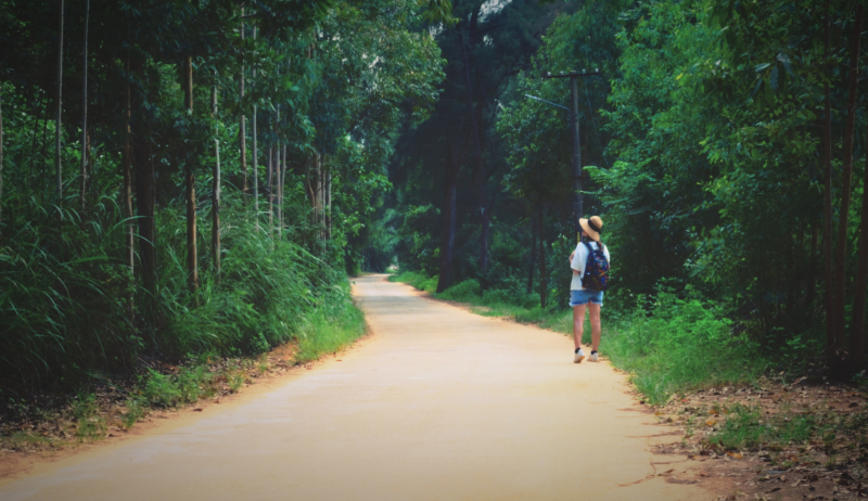 走在烫脚的柏油路上,阳光刺眼,身边的绿植浓密得就像墙壁一样。
