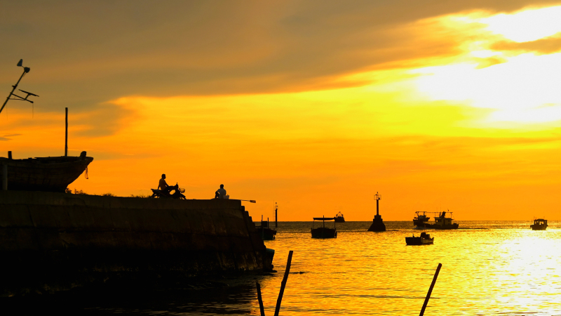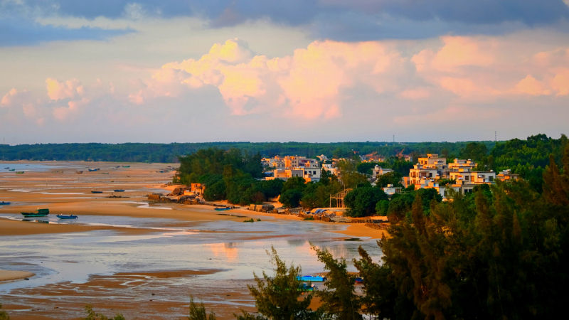 每当夕阳西下,海面退潮几百米远,白天普普通通的小村子,连同头顶上堆叠的云海一起,被撒上一层明晃晃的“金粉”,远远看去,仿佛日照金山一般。