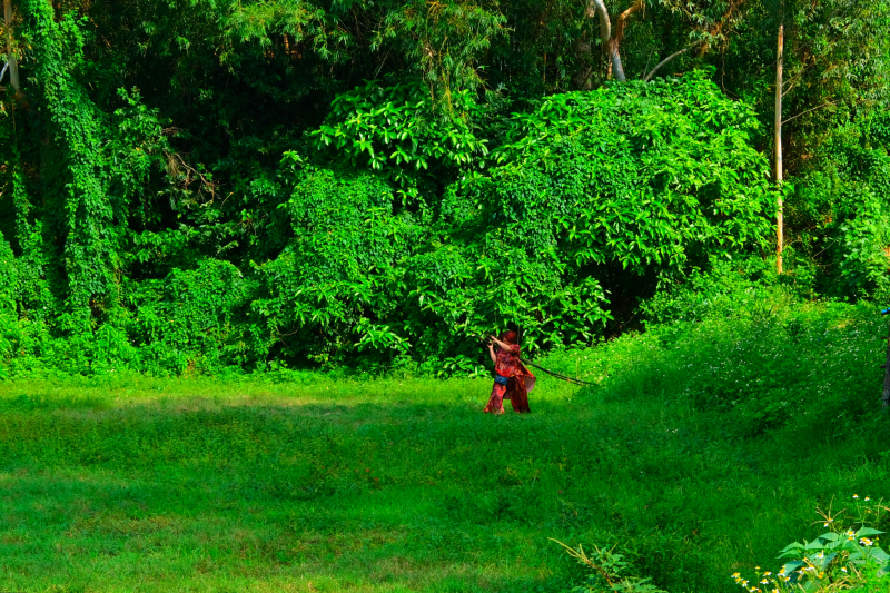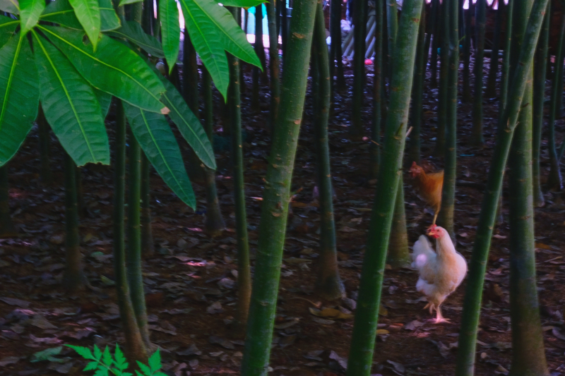 就连鸡鸭都是散养,在高大的灌木丛下找食儿吃。