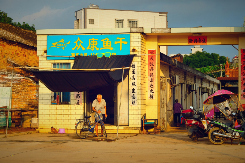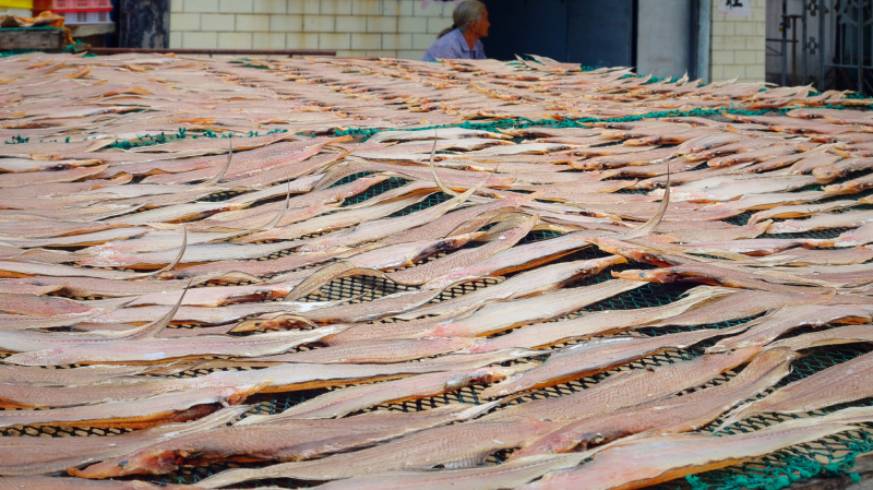 这里有很多卖鱼干的小店,店主人把鱼切好、串起,一排一排地晒在自家的门口;