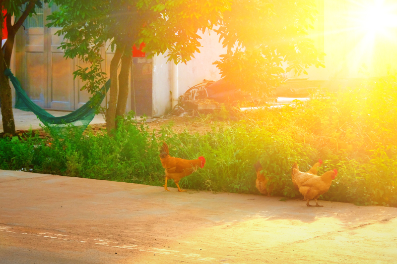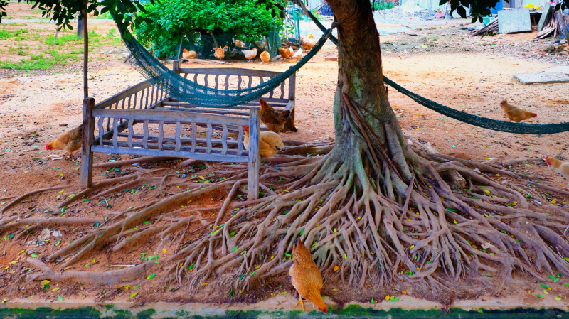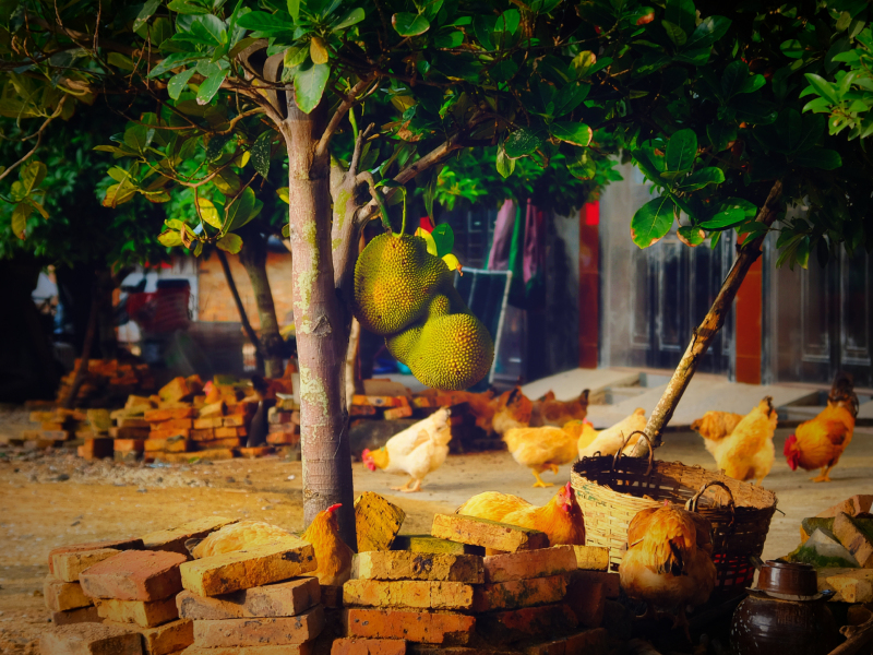 这里的家鸡都喂得很肥,气定神闲地在菠萝蜜树下踱着步子找食儿吃;