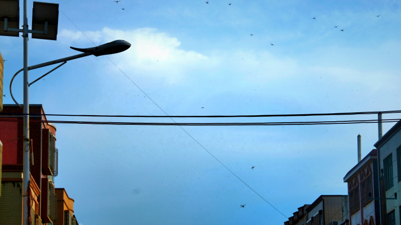 每天下午,蜻蜓成群结队地盘旋在半空,并不会下雨,就仅仅是习惯性地飞得很低。也不怕人,一只一只,就像迷你的小飞机。