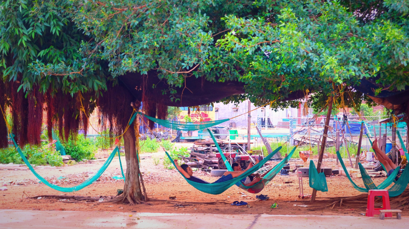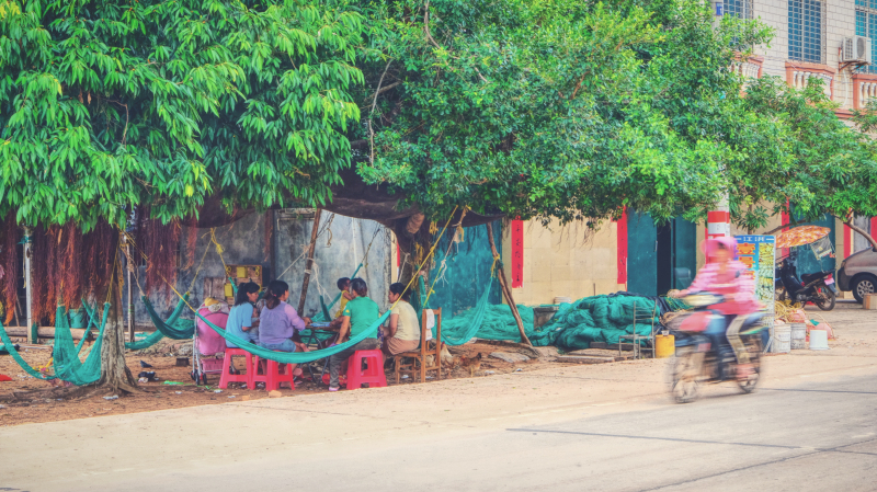 出海打渔的男人们回到家,会躺在树下打个盹儿、玩一玩手机;