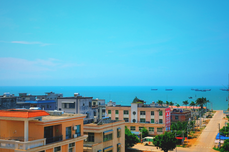 透过民房屋顶,可以看到后面的大海,海水特别鲜亮,和天空一色,无缝衔接。