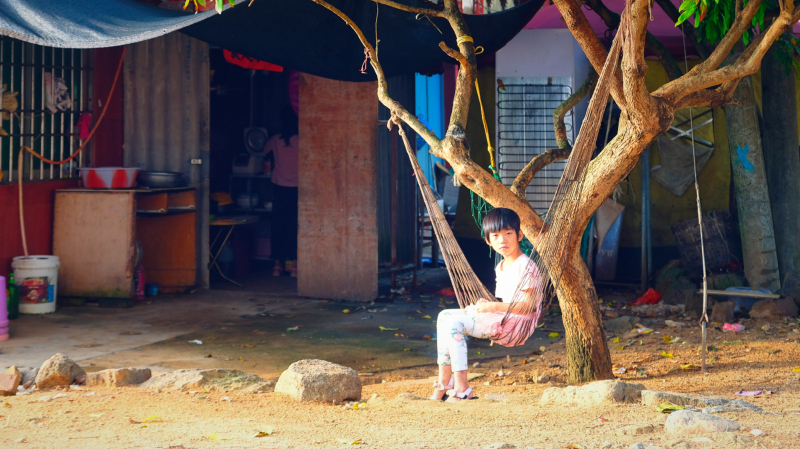坐在旧渔网制作的秋千上的小姑娘好奇地向我张望,我冲她挥挥手打个招呼,她显然还沉浸在“一头问号”中,没有缓过神儿来……