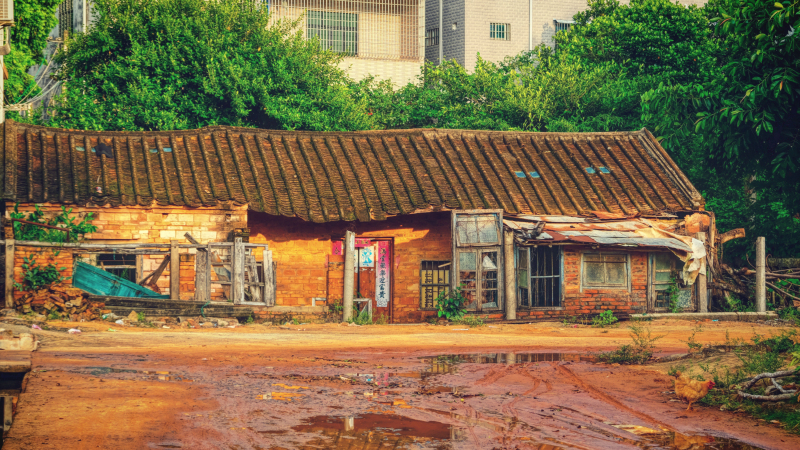 雨后的小路泥泞了一层又一层,小水洼映着破败的老屋,年久失修、许久无人居住的样子;
