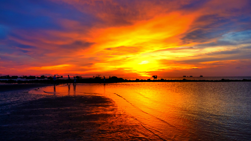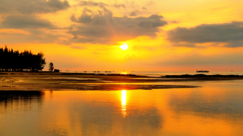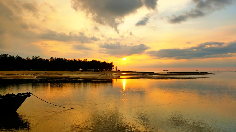 这里是雷州半岛的西海岸,每当夕阳西下,暖色的光晕绕在仙裙岛周围,一草一木都变得明快而温和。远处的渔船也静静地卧在一角,安于做那只画里的风景。