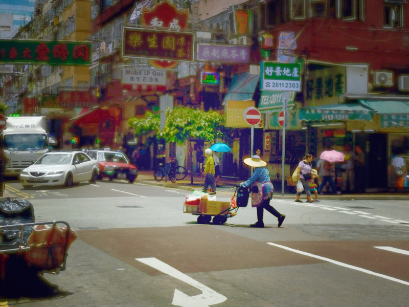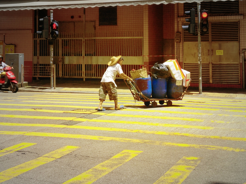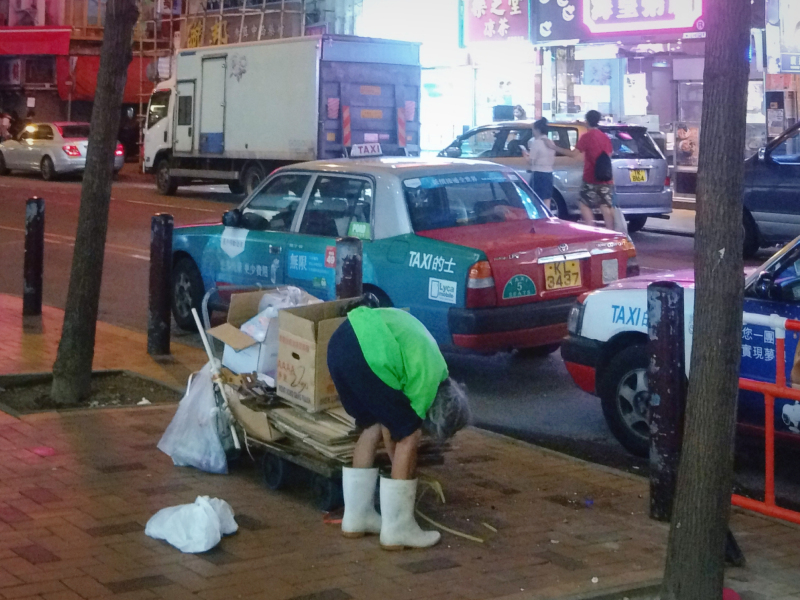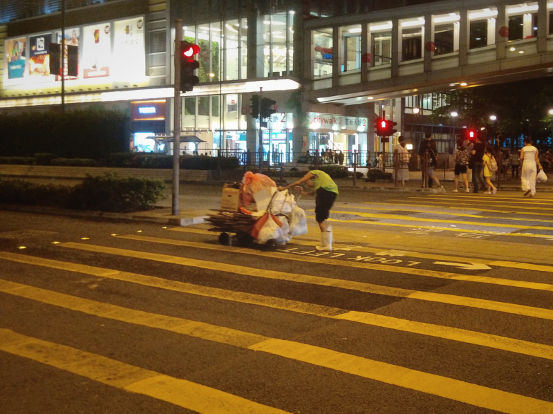 在香港旅行期间,经常看到老人推着捆满废旧纸箱和乐色的小推车过街。