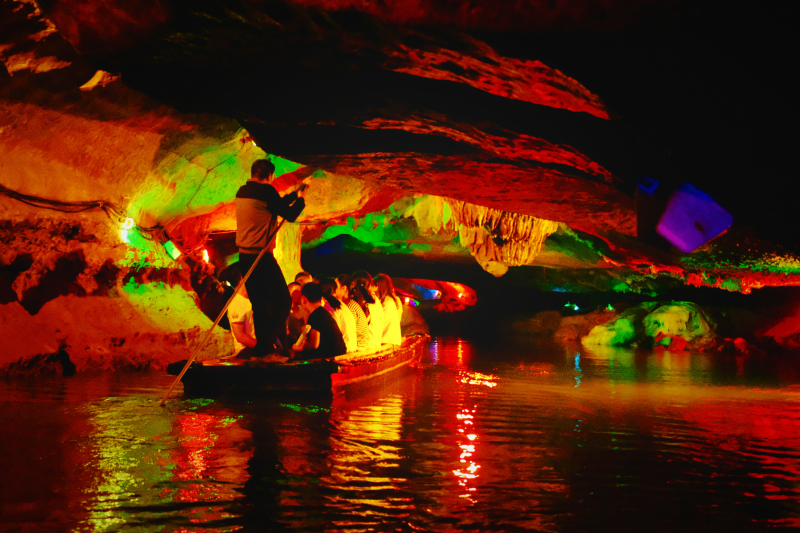 这里有一条长750米、深1米的九曲暗河,行船过河到达一处宫厅,沿厅上行,可观太极洞著名奇境“洞中黄山”,一览埋藏于地下上亿年的山脉奇绝。