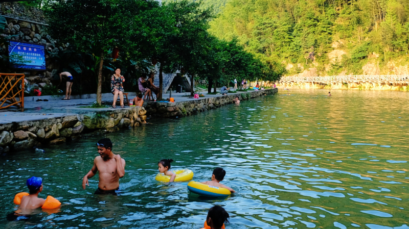 坐在岸边歇脚,观察到到很多穿着泳装的人显然是全家同游。大人练习跳水,孩子们在一旁扑腾欢闹,头顶清幽密林,如同天然大伞庇荫。