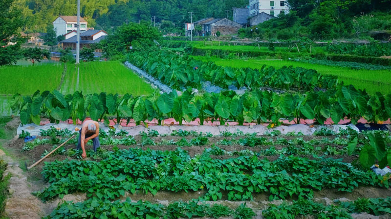 田地里的作物划分了小小的片区,高高低低,村民也如同我们在画里头看到那样在田间劳作——戴着黄色的草帽,穿着简朴的农服,随意挽着袖子,卷起的袖管翻出一截白色,一切都那么自然、纯净……