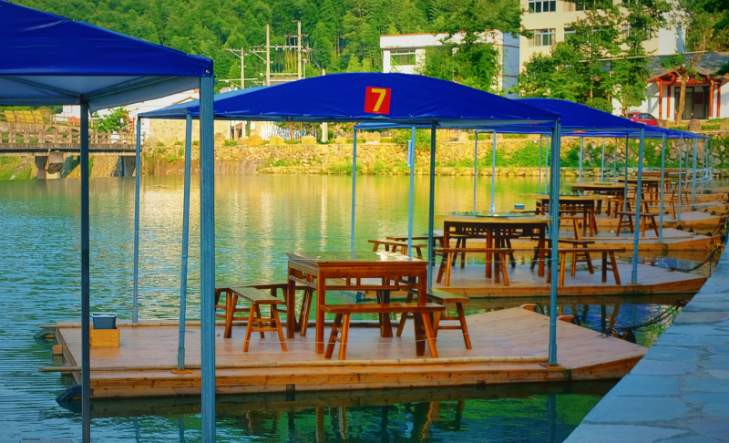 起身沿着水边的木栈道走走,身侧那一处一处的小木屋,是临水而建的特色民宿。