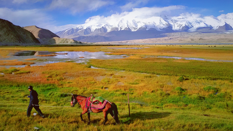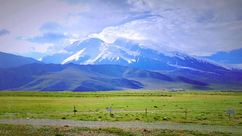 我们的车沿着卡拉库里湖边数万亩的草场继续前行,无边无际的洇洇沼泽在雪山之下绵延数十公里,地势由高至低缓缓而去。