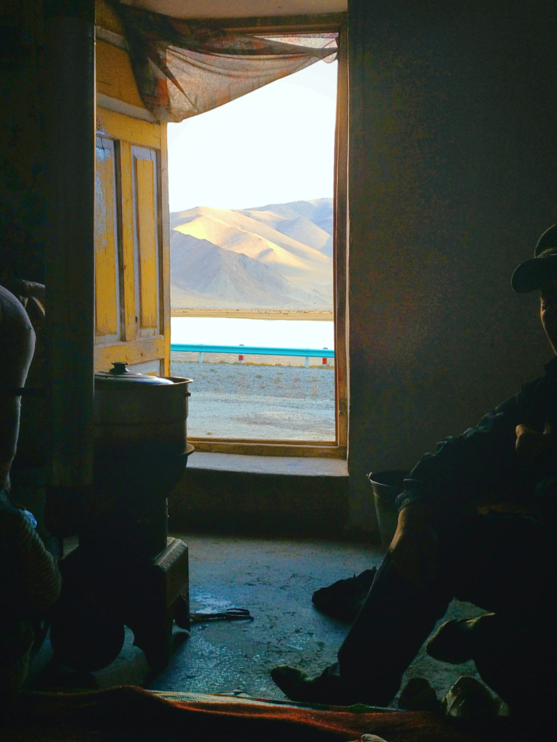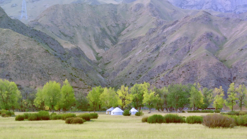 我们住的那间房子的房门正对着卡拉库里湖,“傍晚”8点钟,夕阳还未落山,路上来往的车辆逐渐稀少,整座山谷一下子深沉下来,静得似乎就只剩我们几个人。