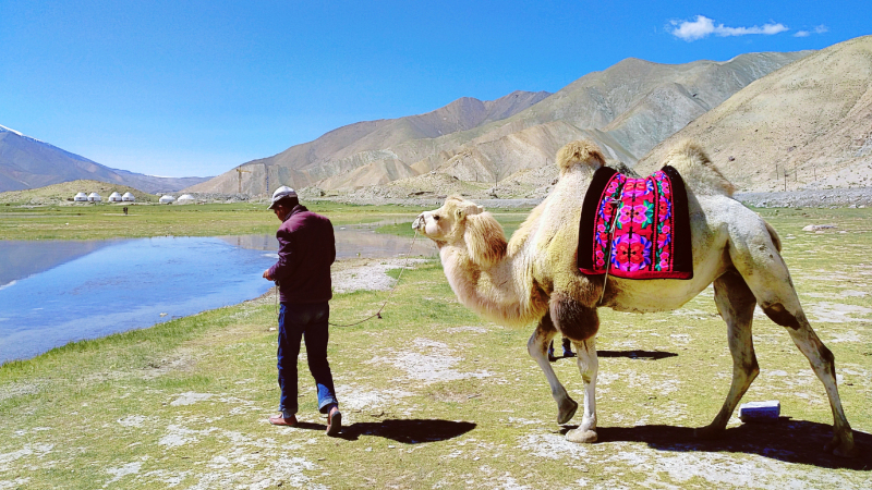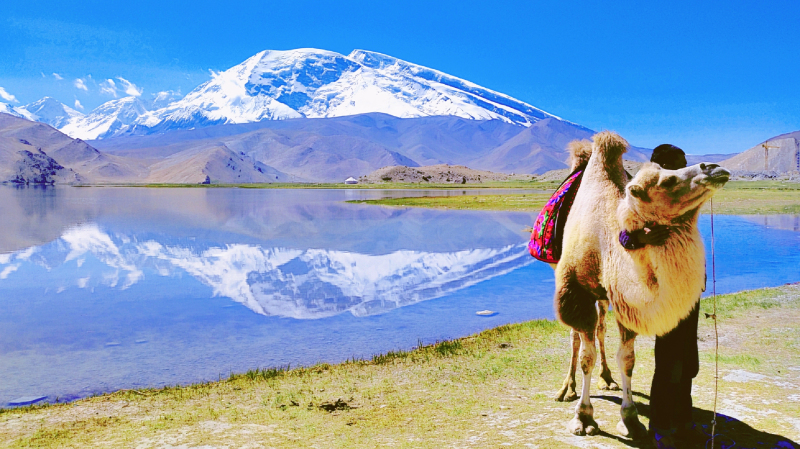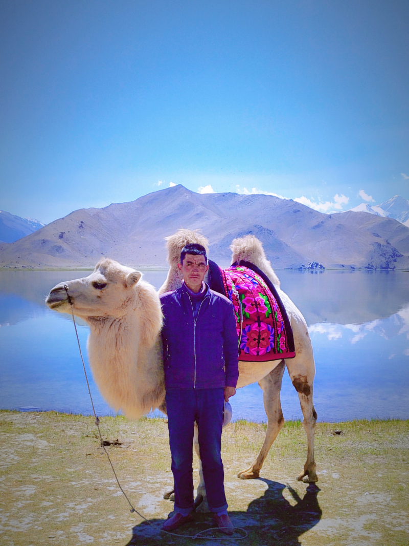 那时每日都有塔吉克族(或柯尔克孜族)人牵着骆驼沿着湖岸招揽生意。他们的骆驼很乖,毛发都被精心打理过,整齐和顺。