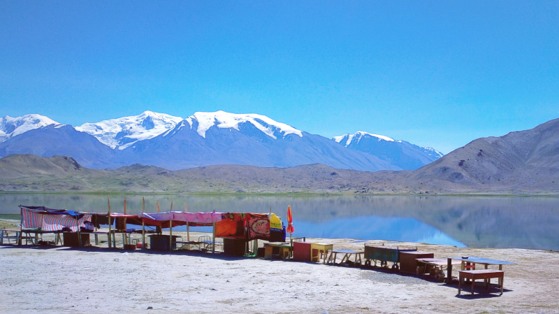 那时的卡拉库里湖边还搭着很多带有彩色围帐的小摊子,先开始我以为那是新疆烧烤摊儿,后来才知是卖玉石子料的商户铺位(啊吃货是真的没救了)。