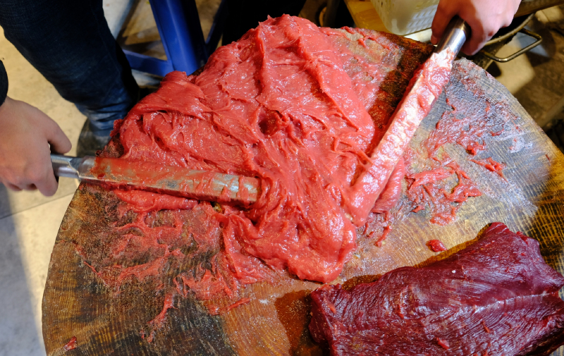 再用两只很重的金属棒子,使尽吃奶的力气把肉打碎,再用第二波吃奶的力气继续敲打,直到打成鲜红鲜红的肉浆子。从一块肉棒到打成肉酱,中间要经历20000多下击打,必须要纯人力、纯手工来击打,机器打出来的没有“灵魂”,不好吃。