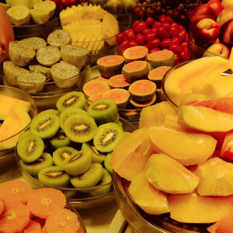 水果切成小块论斤称,各类小食类目丰富,一次可以吃到很多种……