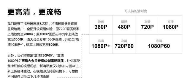 https://i0.hdslb.com/bfs/article/cf9f6558e032c833e7f52924baea568802c7b39a.jpg@1280w_548h.jpgBilibili做出的官方宣传页称,将提升播放器的画质,在720P的画质下提高码率上限,并且1080P的画质码率上限会达到3000K,大会员的1080P的码率上限拉倒6000k,并且开启1080P60帧的上传通道,以后在B站观看视频,将获得更加流畅的体验。