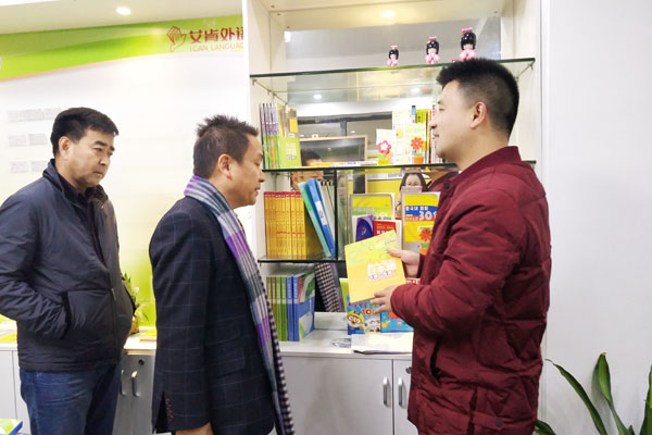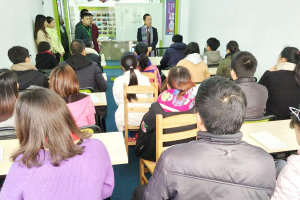 艾肯外语皇甫校长向来宾介绍与北京外国语大学外研社合作教学的