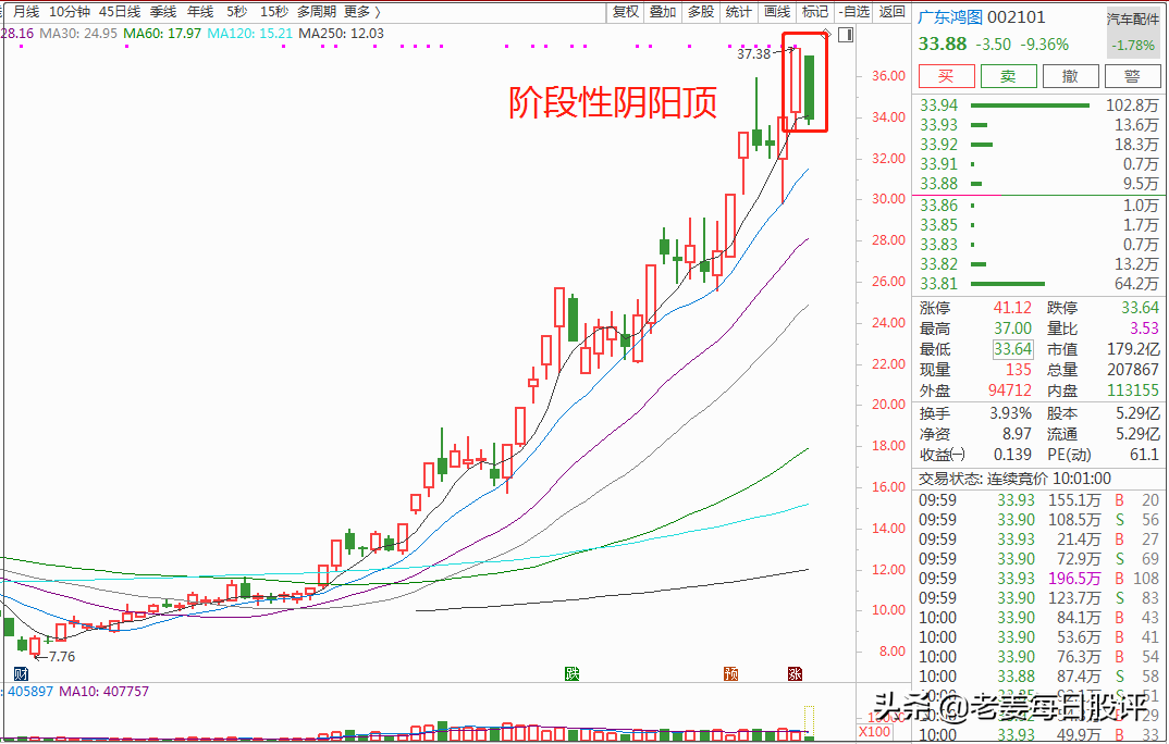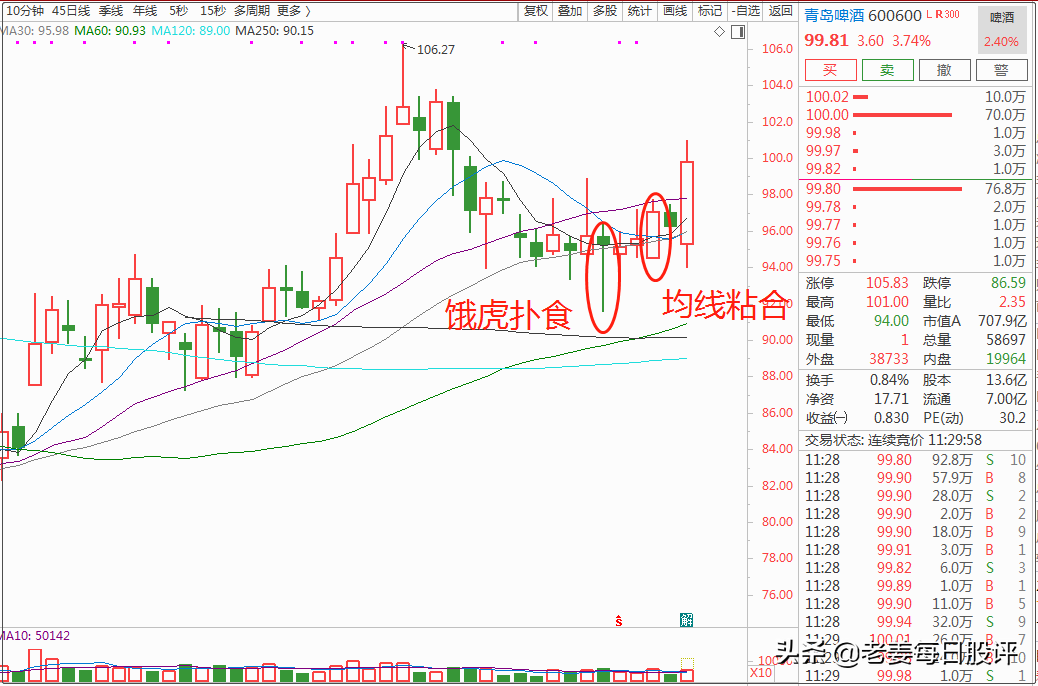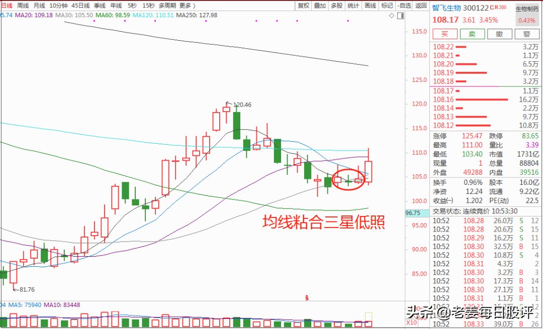 盘口上也非常有意思,符合我们近期重点留意的信号,也就是经过连续回调后,出现均线粘合三星低照,正好又有消息面的共振,于是形成了脉冲。