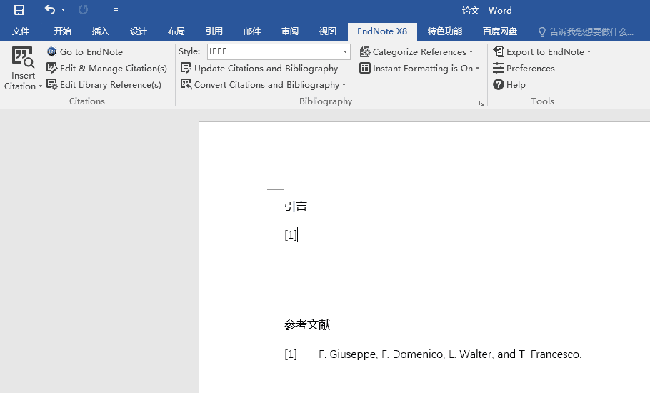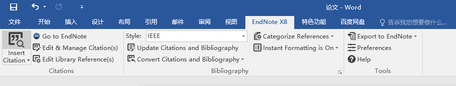 打开Word,Endnote安装后会自动出现在菜单栏,点击“Endnote”>“Insert Citation”选择你需要引用的文献,就可以在论文中引用文献