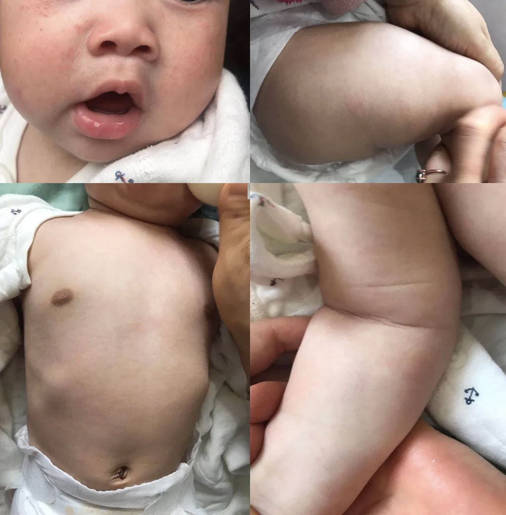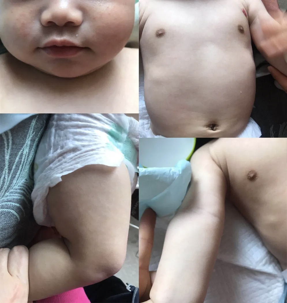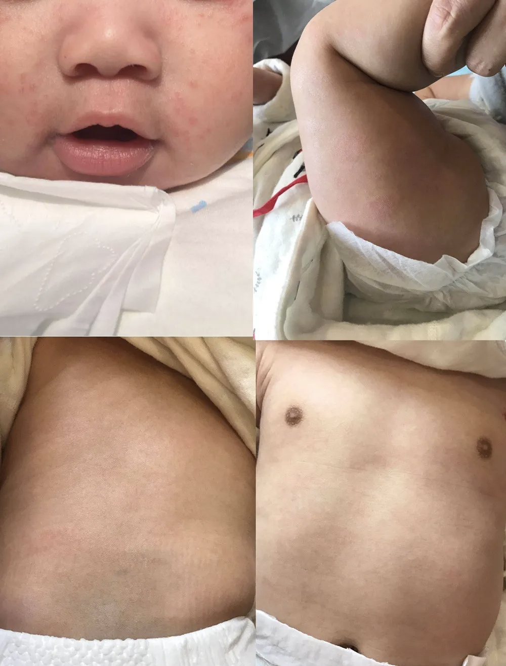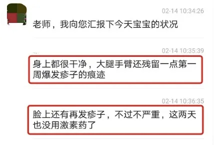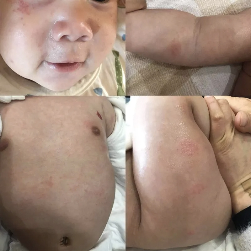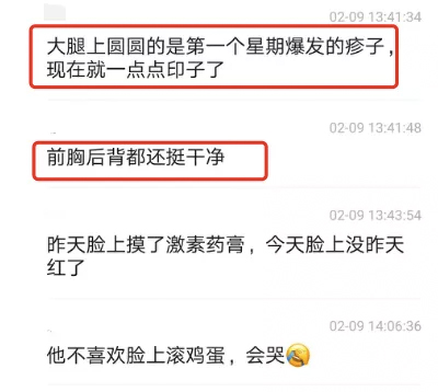 2月9日,妈妈反馈孩子的身上都很干净了,之前爆发的疹子都只剩下淡淡的印子了。但之前脸上用激素药物压下去的疹子还在继续爆发。
