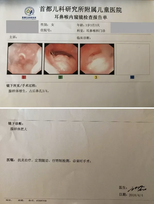 医嘱建议抗炎治疗,每晚睡前口服孟鲁斯特纳咀嚼片、鼻渊舒口服液,同时进行睡眠监测,三个月后复查,若腺样体没有改善,必要时进行手术。