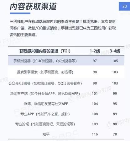 酷鹅用户研究院的数据显示,三四线用户在移动端获取内容的渠道主要是手机浏览器,其次才是新闻客户端、微信/QQ推送。