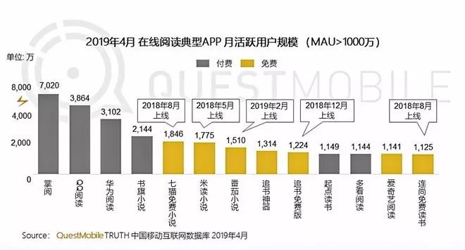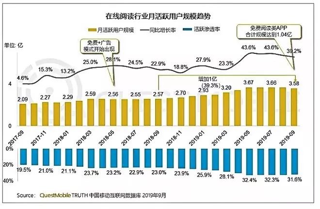 (可以看到随着免费+广告模式出现,免费阅读类APP用户规模的增加,以及活跃渗透率的增加。所以这个模式并不只是来分蛋糕,实际上也是来做大了蛋糕。来源:QuestMobile)