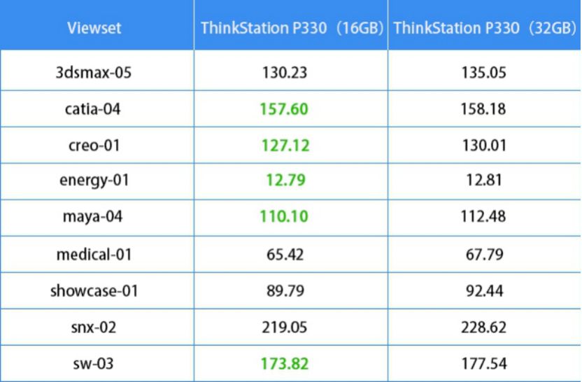ThinkStation P330定位于基础主流应用,送测样机所配备的32GB内存属于较高配置,为了具有更大参考价值,在测试时特意进行了16GB/32GB两组测试,供用户参考。