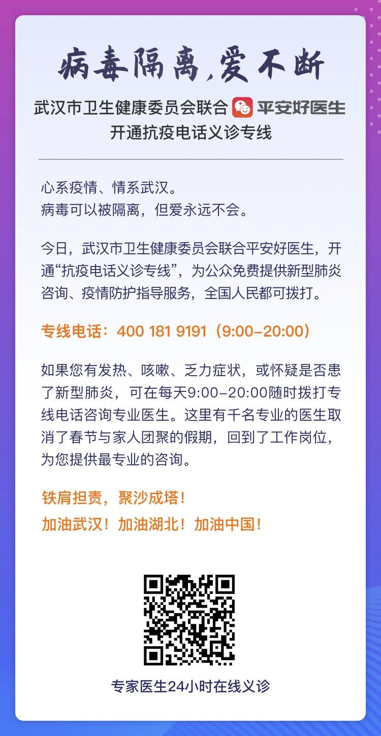 就在今日,武汉市卫生健康委员会联合平安好医生,开通“抗疫电话义诊专线”