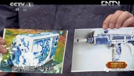 没想到主持人竟当场拿出一张青花瓷大彩电,还有一张青花瓷冲锋枪的照片,主持人说这都是在海选时拍摄的照片,藏友们说是郑和下西洋的生活用品和武器。