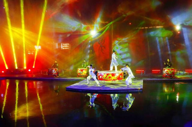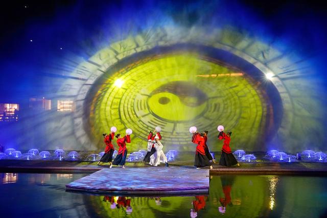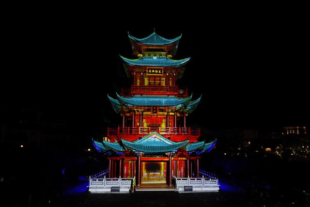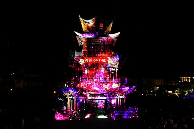 古色古香的建筑,霓虹闪烁,仙光四射,通过现代化的声光电设备在高塔上展现出不同的夺目场景,游龙、飞凤、风光、人物...与宏大的音效一起带来如梦似幻的视听盛宴。