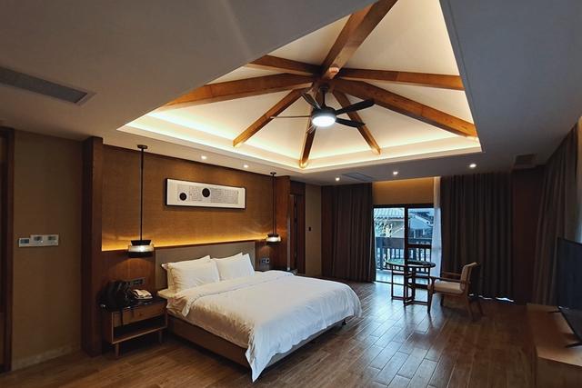 夜已深,很多周边特意来欣赏葛仙村夜景的游客已经离开,我们也回到了葛仙村内最高端的洗心院主题酒店,走的是轻奢路线,别墅房间面积极大,以木制材料为主,家具和装饰都极具质感,巨大的阳台环绕,窗外就是灯火辉煌的众妙阁,清晨在鸟啼蛙鸣中醒来,聆听溪水潺潺,遥望绿水青山,与大自然说早安。