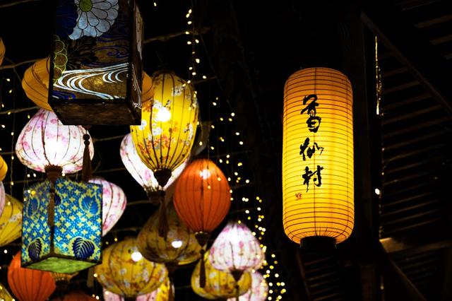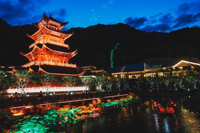 夜幕降临后的葛仙村,才是真正的古韵十足,如梦似幻。整个园区的所有的建筑瞬间被点亮,一片灯火辉煌,如万千繁星洒落山谷,如梦似幻的古乐随风飘过,开启一场震撼视觉和听觉的盛宴。