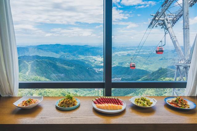游人们已经不用像当年香客那样风餐露宿,一千多米高的天镜台上现在有了设施齐全的酒店,早晨观日出云海很是方便。我们没在山顶住,只是中午去素心斋素食餐厅品尝了新鲜的素食,这家素食并不像大城市那样漫天要价,18元起就可以吃到绿色有机的当地应季果蔬,关键窗外的风景甚是壮阔,绝对值回票价。