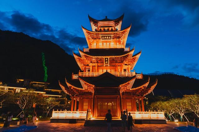度假区的中心树立着高26米的众妙阁,正在葛仙村阴阳交汇之处,从四面八方都可以看到。三层四柱纯木宝塔形状,继承了中国古代传统建筑的精髓,华灯璀璨,灯影弥蒙,宛若仙境,特别适合在前面拍摄人像。