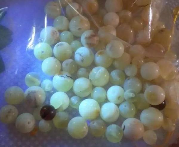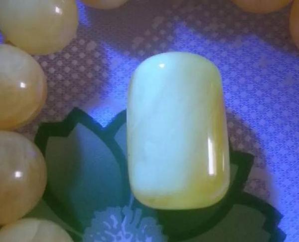 波罗的海沿岸国家所产的琥珀蜜蜡,打磨去皮后的原矿以及刚加工出来的成品,荧光反应一般为淡绿色。