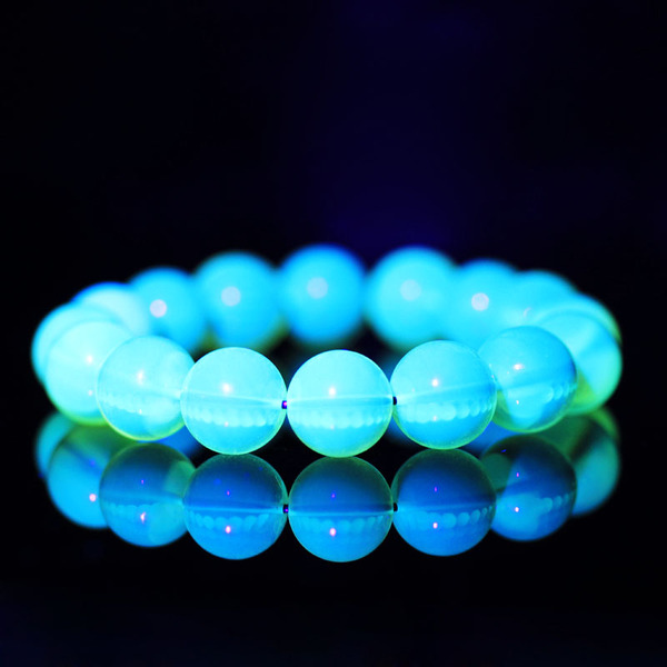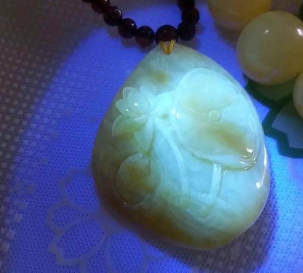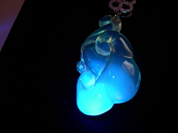 琥珀蜜蜡在365紫光灯的照射下会发出或蓝或绿的荧光,这个是鉴别真假琥珀蜜蜡的重要手段。
