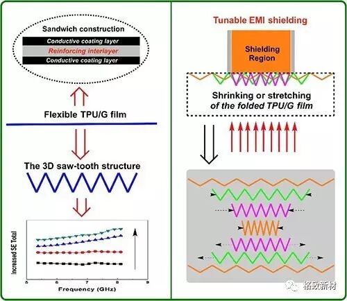 图1. 高强度柔性聚合物/石墨烯复合薄膜以及锯齿形折叠结构示意图