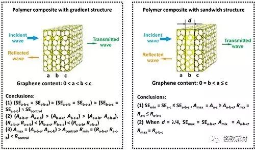 中空三明治结构)对聚合物/石墨烯复合材料电磁屏蔽性能的影响。首先,通过对不同石墨烯含量的聚合物/石墨烯复合泡沫进行自由叠加组合可以制备出不同梯度结构的复合材料,结果表明:①梯度结构对复合材料的电磁屏蔽性能影响较小,但却可以大幅提升复合材料与空气之间的波阻抗,进而增强对电磁波的吸收性能;②吸波性能最强的结构设计是具有a-b-c结构(如图2所示),而对电磁波反射最强的结构设计是c-b-a结构。另外,将透波材料夹在两层聚合物/石墨烯复合泡沫之间可以得到一种具有中空三明治结构的复合材料,结果表明:①中空三明治结构可以大幅提高复合材料的屏蔽性能,但是主要原因是增强了材料对电磁波的反射;②三明治结构对复合材料屏蔽效能的提高量与其中间透波层的厚度有关,当厚度为对应频段1/4波长时,其增幅最大。该研究对于设计具有高屏蔽和吸波性能的聚合物基电磁屏蔽材料具有较大的参考价值,相关结果发表于国际期刊Composites