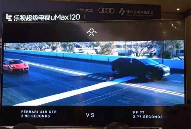 他现场展示了一段战略伙伴FF量产车的竞速视频: FF量产车超过了世界上最快的跑车法拉利。