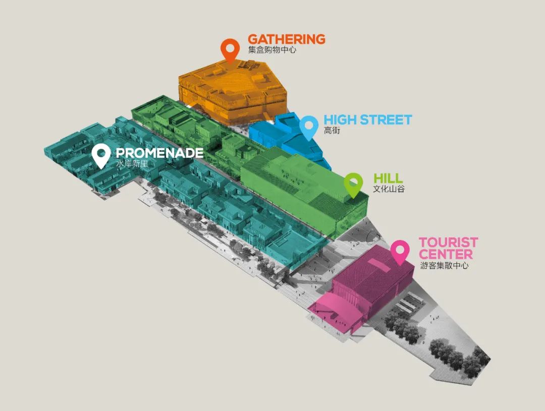 这三大分区内包含五大空间:集盒购物中心、高街、文化山谷、游客集散中心、水岸新里。