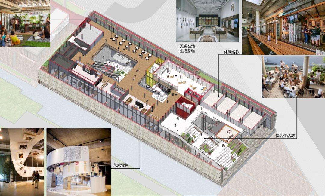 项目体量约4.3万方,地块整体规划形成沿街商业区、保留改造区和滨水商业区三大分区: