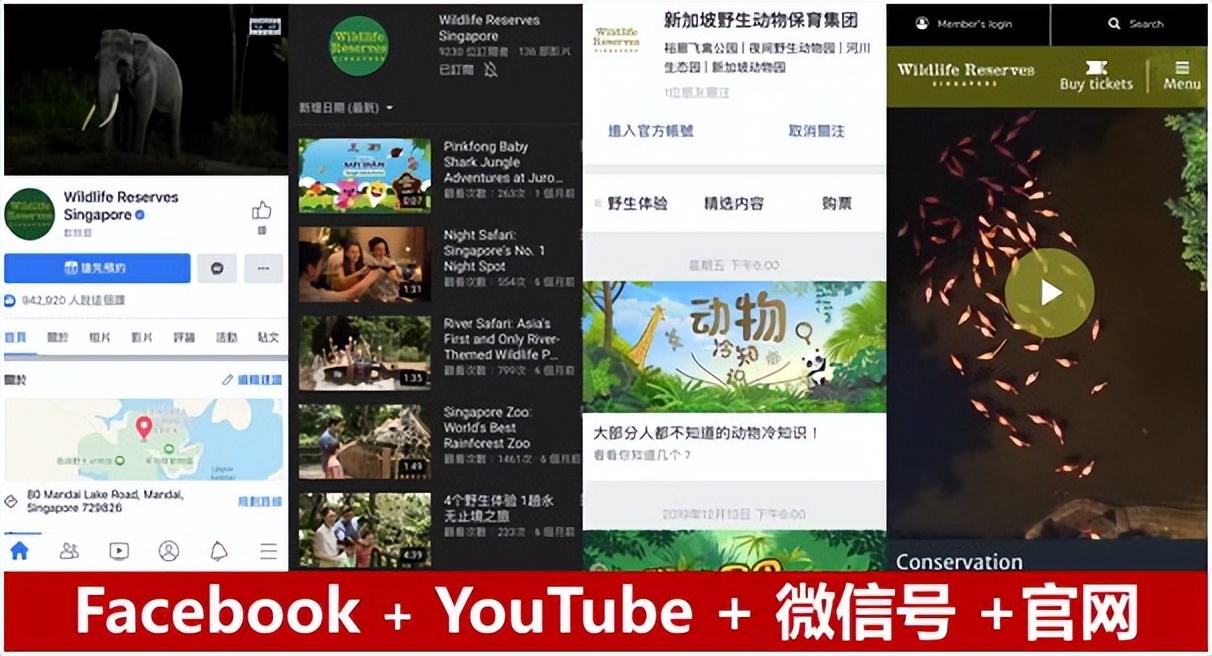 新加坡夜间野生动物园的官方网站、Facebook、YouTube、微信公众号账户,皆是隶属在Wildlife Reserves Singapore(新加坡野生动物保育集团,简称WRS)名称之下,WRS也是新加坡4大动物园的实际运营管理方。在官方网站、Facebook、YouTube、微信公众号4个传播渠道中,WRS又以Facebook为主要发力点,日更频繁,并且有一鲜明的特色:近八成的贴文都是文字加自制视频,少数才是文字配照片。