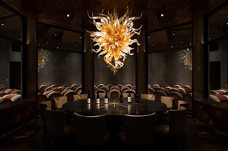 迷宫一样的圆形地下酒窖深处,有一个用透明玻璃搭建出来的空间,中间摆放着一张中国式的大圆桌,圆桌中央的上面,挑高着一盏金黄色、结着果实、火焰般的玻璃灯具,造价同样不菲,是美国西雅图著名艺术家Dale Chuhily的作品,名字叫Imperial Topaz,翻译过来更霸气一些:帝王玉。寓意却是与土地上的大地之母和自然之母相对应,象征着阳光普照下的幻影酒庄大地,结满了丰收的累累硕果,酿造出世界上最好的葡萄美酒。