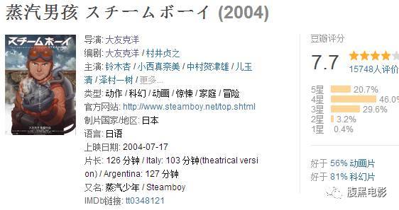 这么一趟对比下来,在俺史臻襄的心中有一种强大的自豪感油然而生:我们绝不在无谓的特效上浪费钱!科科···我们还是继续说动画吧。《蒸汽男孩》豆瓣评分7.7,好于81%的科幻片。